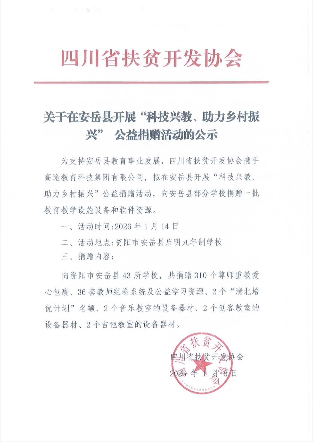 关于在安岳县开展“科技兴教、助力乡村振兴” 公益捐赠活动的公示